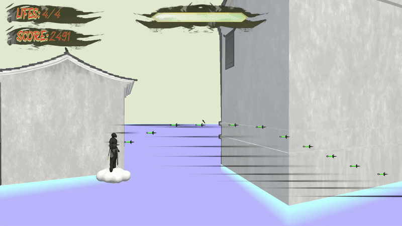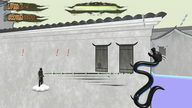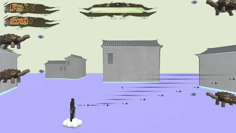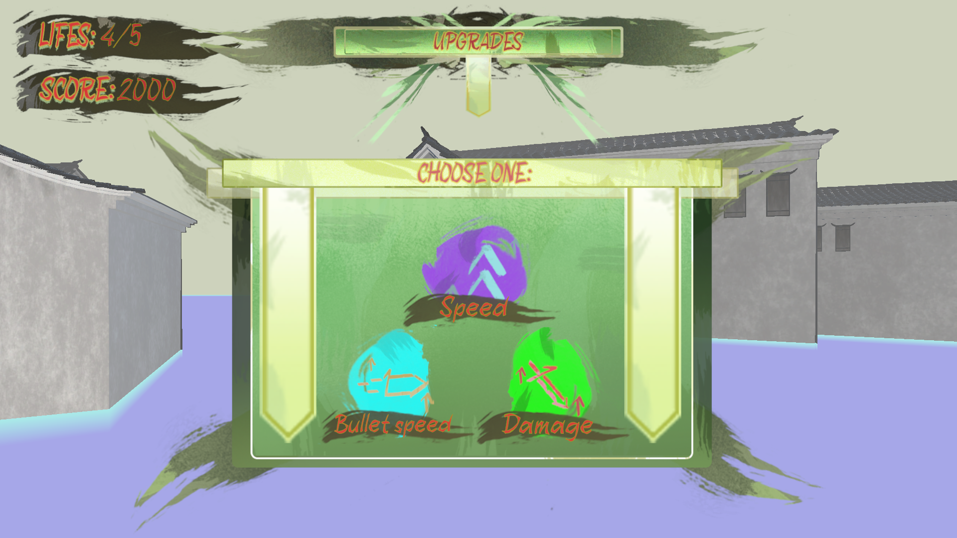 The main character standing up straight stiff is a bit strange. His hitbox can seem excessively large during moments where there are a lot of shots on the screen. Even just having him crouch or bending his knee in a stability stance would help with both those issues. Some minor movement animations on the main character would be a nice detail to make things not feel so static. I'm also curious as to why he is throwing knives when the picture shows a staff. Wouldn't it make sense for him to be shooting ink from his staff given the game title?